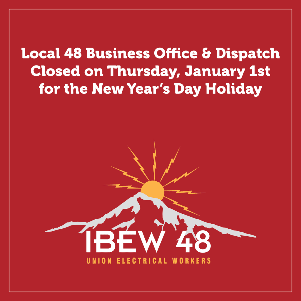 The Local 48 Business Office and Dispatch will be closed on Thursday, January 1st, for the New Year’s Day holiday.