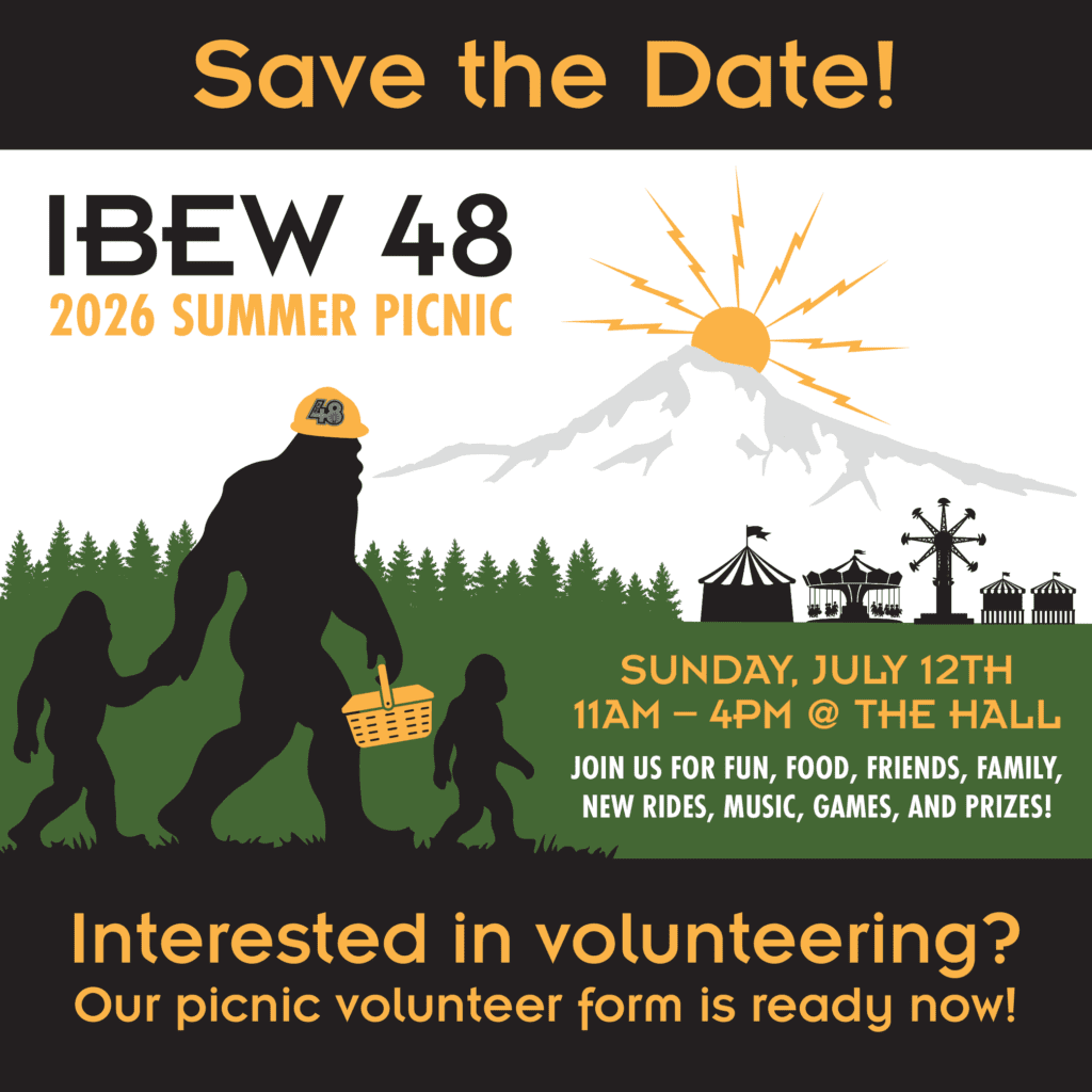 Save the date for the 2026 Local 48 Summer Picnic! It will take place on Sunday, July 12th, from 11am to 4pm at the Hall. Join us for rides, games, food and drinks, music, raffle prizes, and much more!