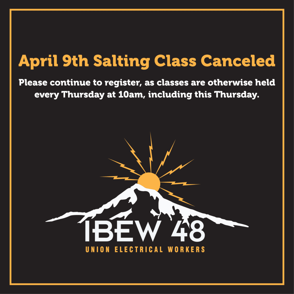 The Local 48 salting (organizing) class for next Thursday, April 9th, has been canceled.