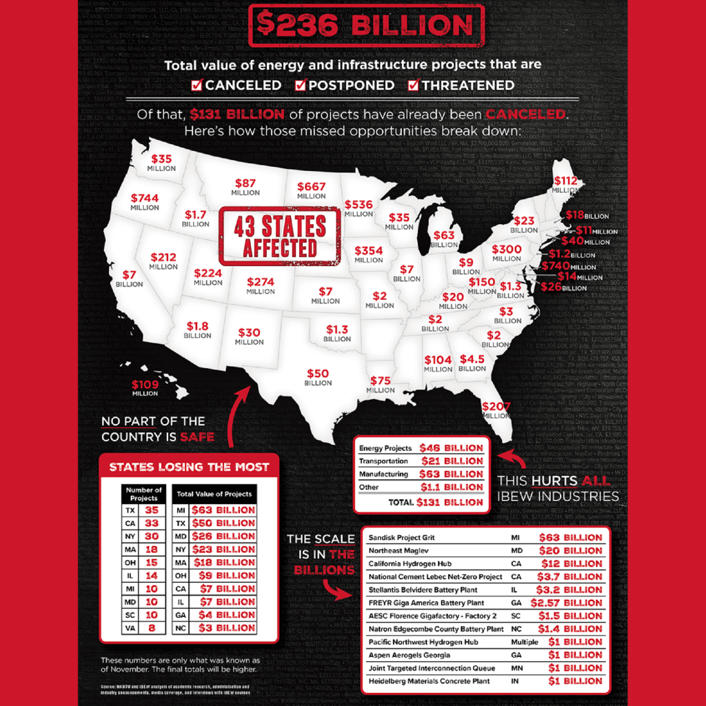 See this recent article from The Electrical Worker about energy and infrastructure projects that have been canceled, postponed, or threatened since the beginning of last year.