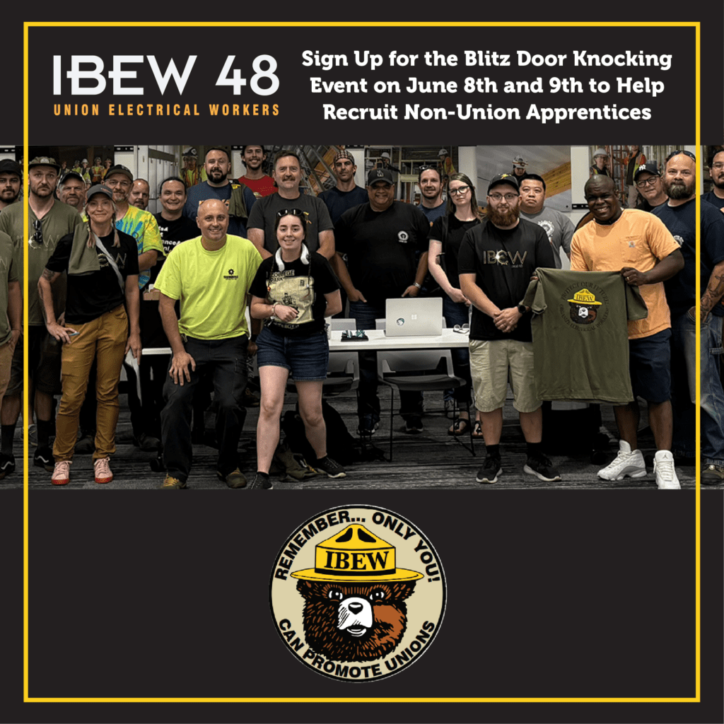 Sign up for the annual Local 48 Blitz Door Knocking event on Monday, June 8th, and Tuesday, June 9th! This year the focus will be on recruiting non-union apprentices to join Local 48.