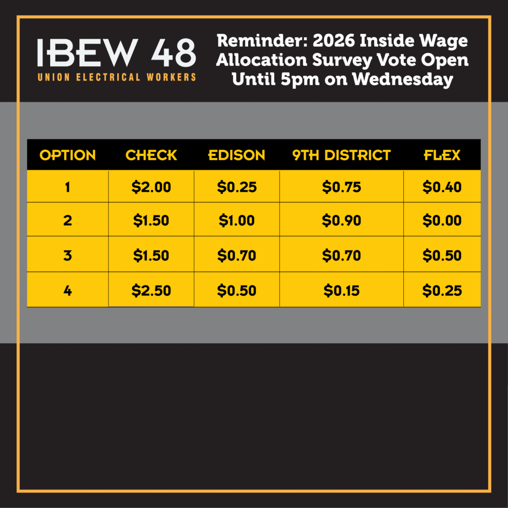 REMINDER: the online survey to determine the 2026 Inside Wage Allocation from the final four options is open for two more days. Eligible voters should complete the survey by 5pm on Wednesday, November 5th.