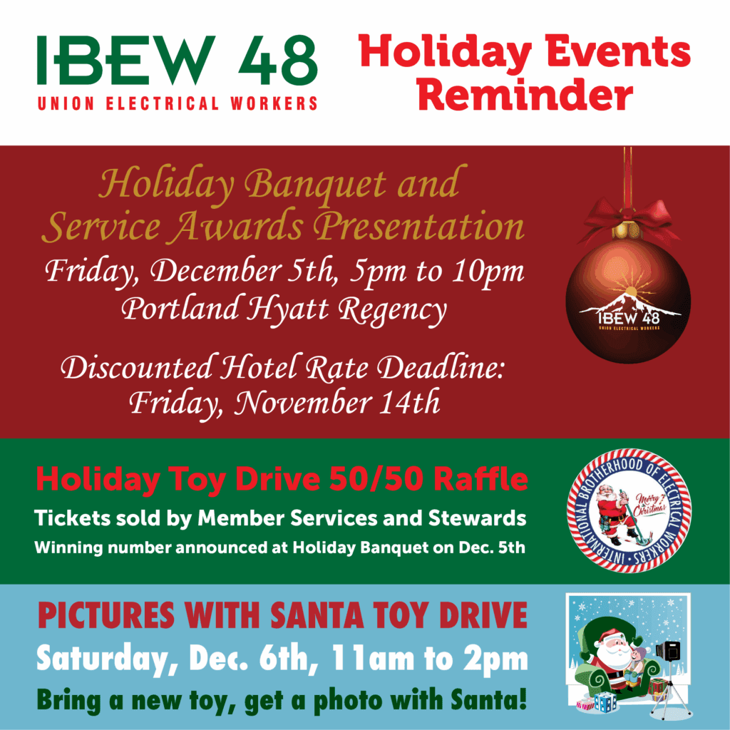 The annual Local 48 Holiday Banquet and Service Awards Presentation will take place from 5pm to 10pm on Friday, December 5th, at the Hyatt Regency Portland. Come celebrate the holidays and enjoy food, drinks, and entertainment with your IBEW Local 48 Brothers and Sisters!