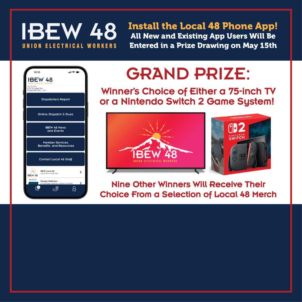 Install the Local 48 Union Reach phone app, and you’ll get direct notifications for announcements from the Hall, including time-sensitive info and announcements that are not posted publicly on the Local 48 website or social media channels. All Local 48 members that have installed the app by noon on Friday, May 15th, will be entered in a prize drawing!
