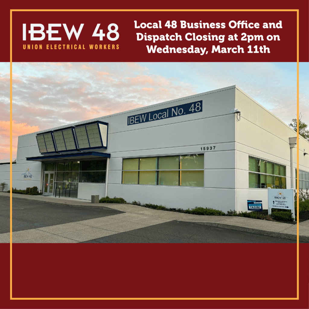 The Local 48 Business Office and Dispatch will be closing at 2pm on Wednesday, March 11th.