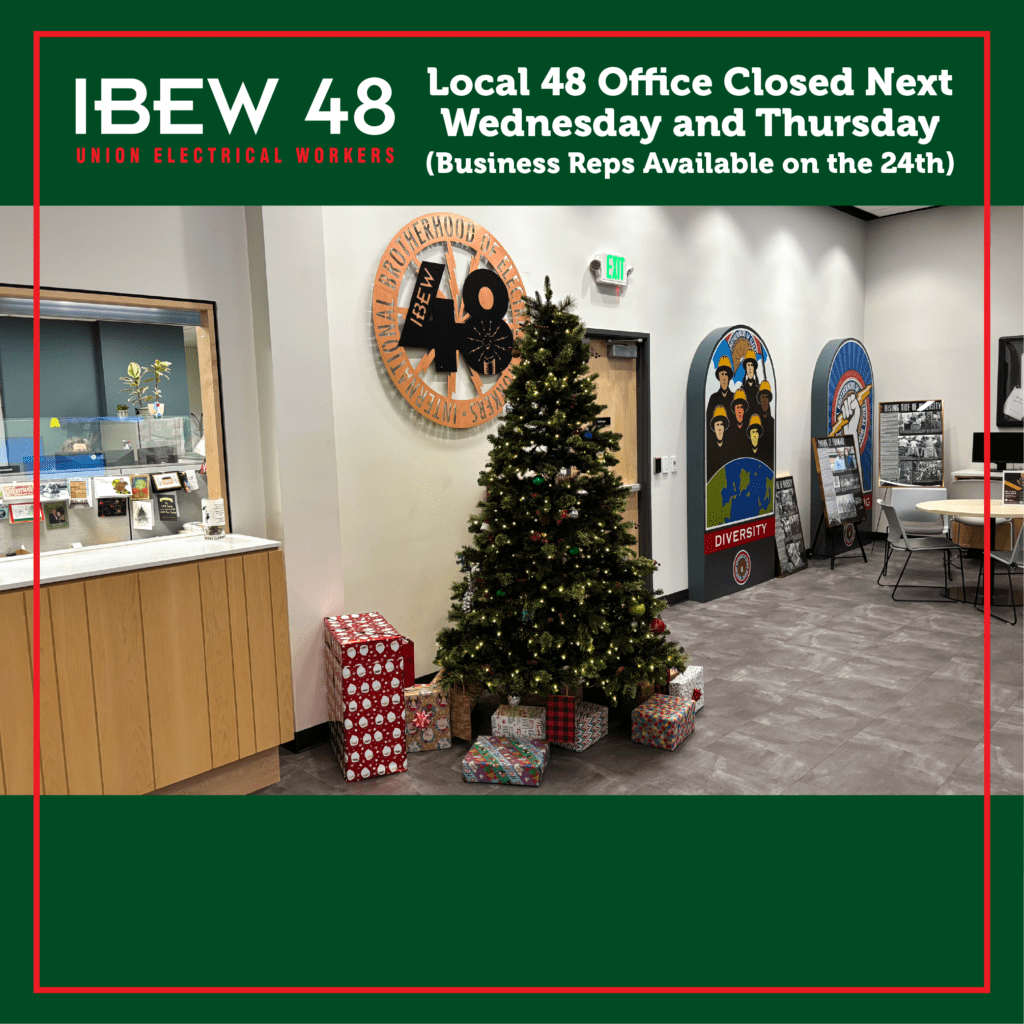 Happy holidays! A reminder that next week the Local 48 Business Office and Dispatch will be closed on December 24th and 25th.