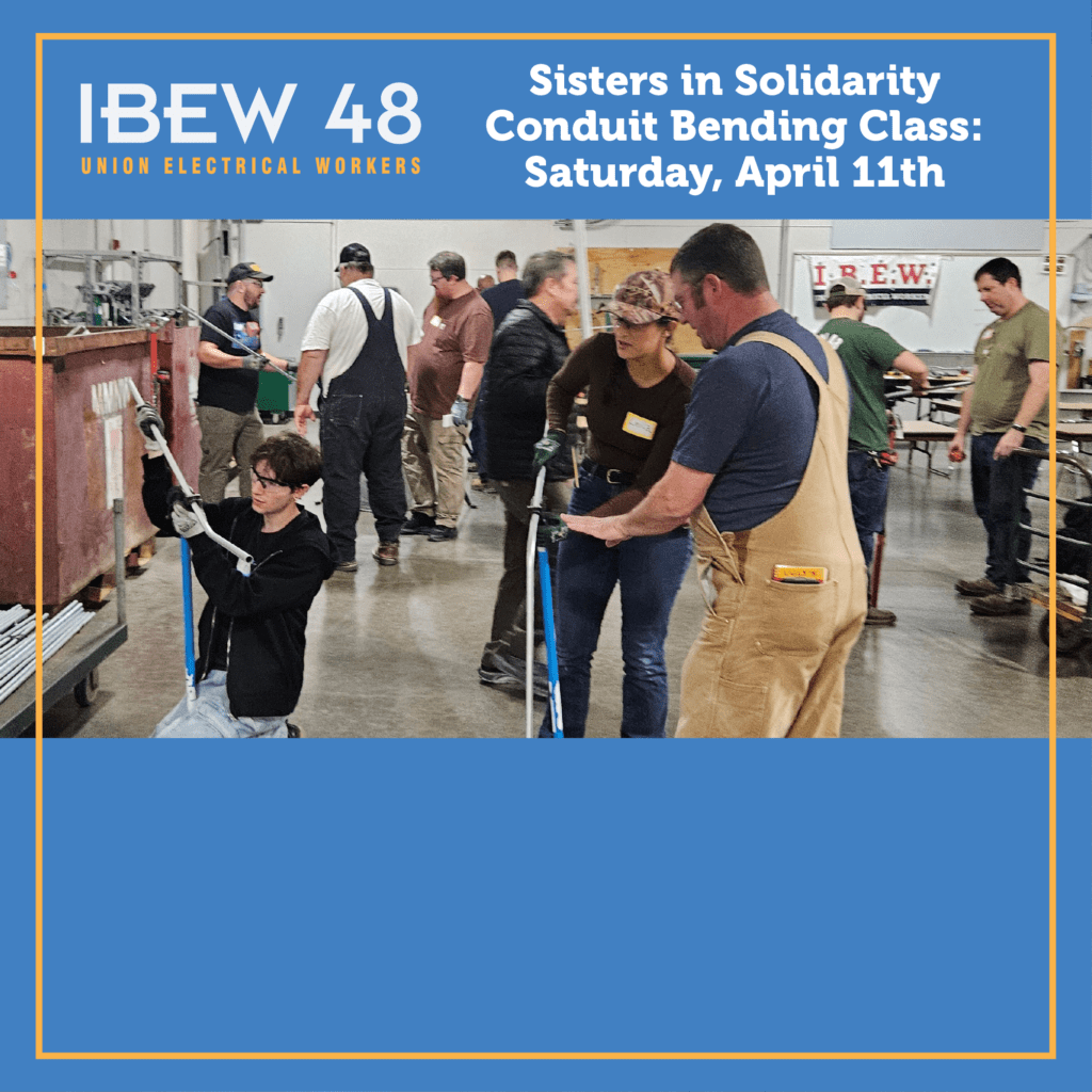 The IBEW 48 Sisters in Solidarity will be having a Conduit Bending Workshop on Saturday, April 11th, from 9am to 1pm in Lab 3 at the NECA-IBEW Electrical Training Center. Refreshments will be provided.