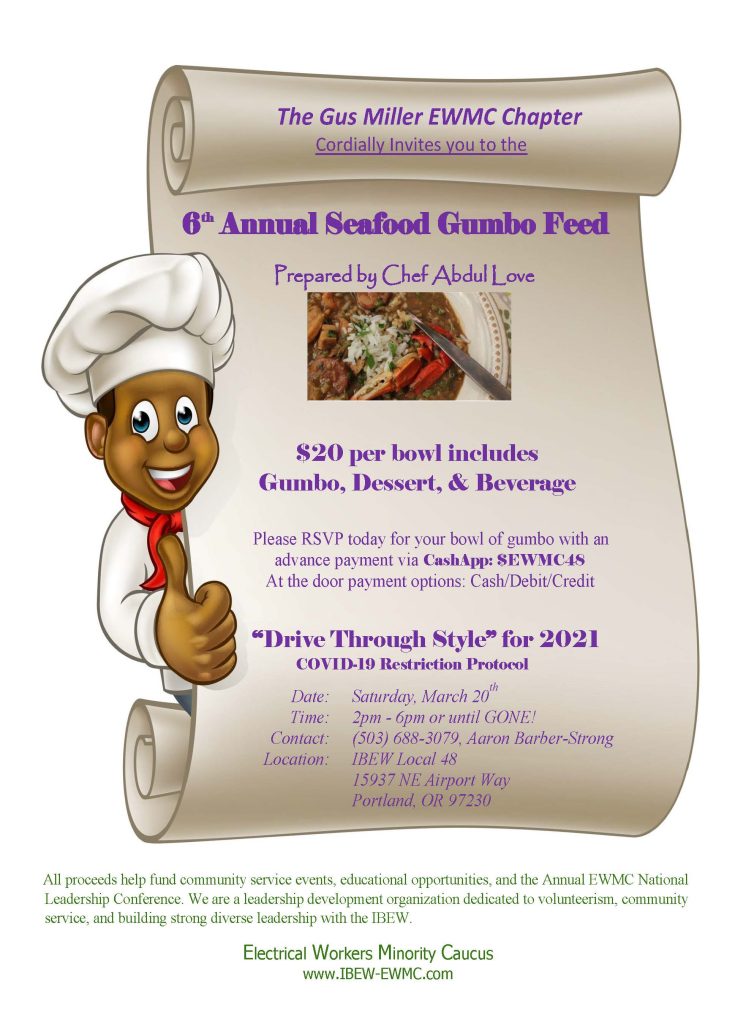 Saturday, March 20, 2021 - 2:00 pm EWMC 6th Annual Gumbo Feed IBEW Local 48 15937 NE Airport Way Portland, OR 97230