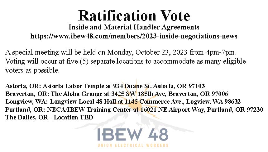 Monday, October 23, 2023 - 4:00 pm Inside & Material Handler Ratification Vote Ratification Vote for The Dalles is being held at: Columbia Portage Grill at the Shilo Inn – 3223 Bret Clodfelter Way, The Dalles, OR 97058