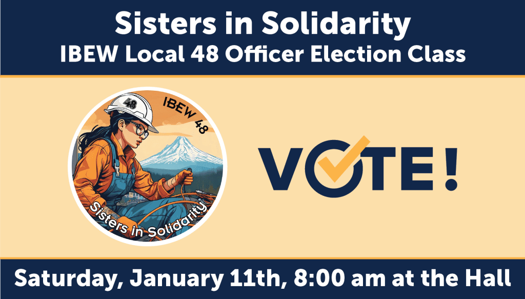 The Sisters in Solidarity training sub-committee is hosting an IBEW Local 48 Officer Election Class at 8AM on Saturday, January 11th at the Local 48 Meeting Hall (rescheduled from the original November 16th date).